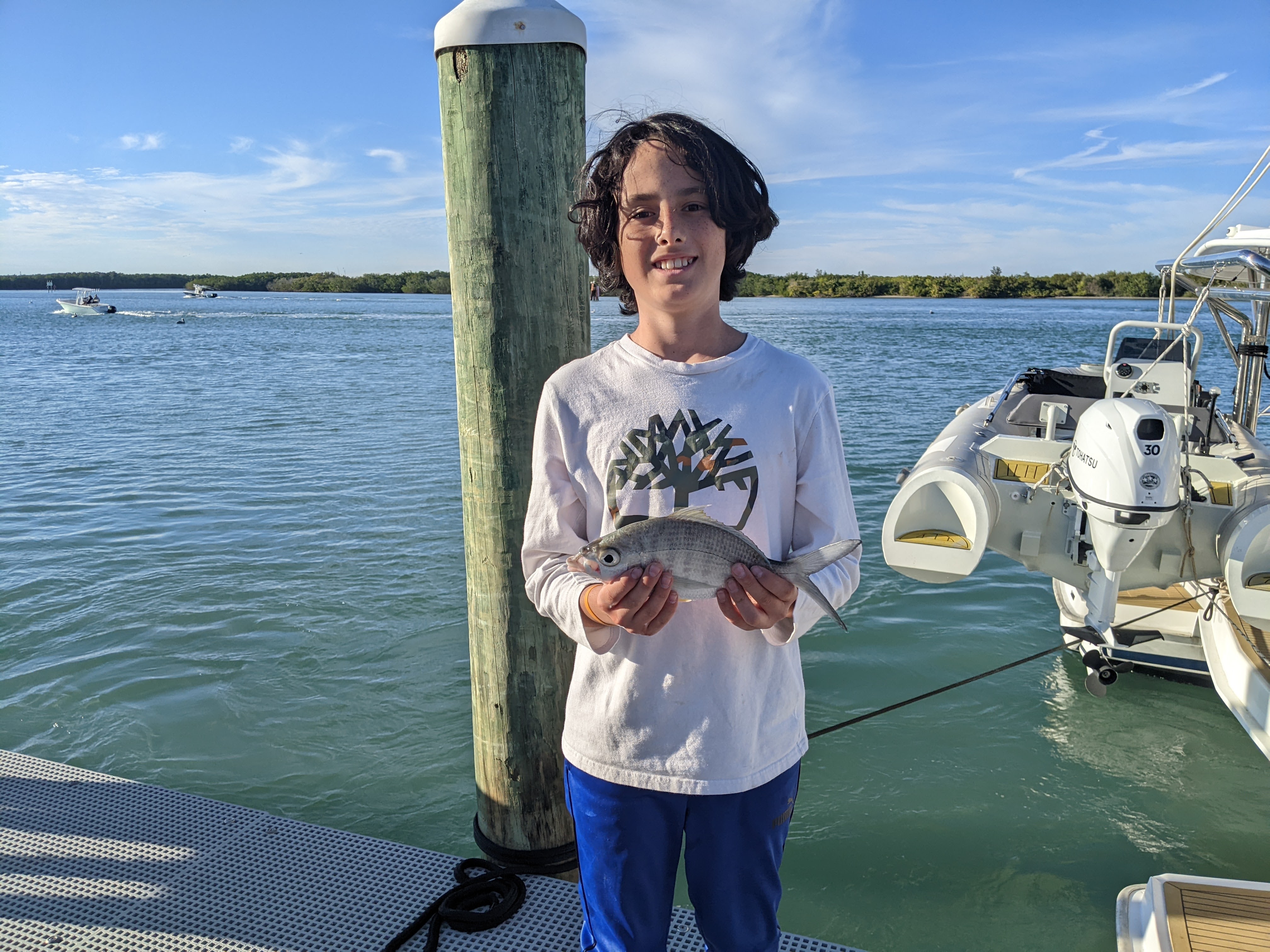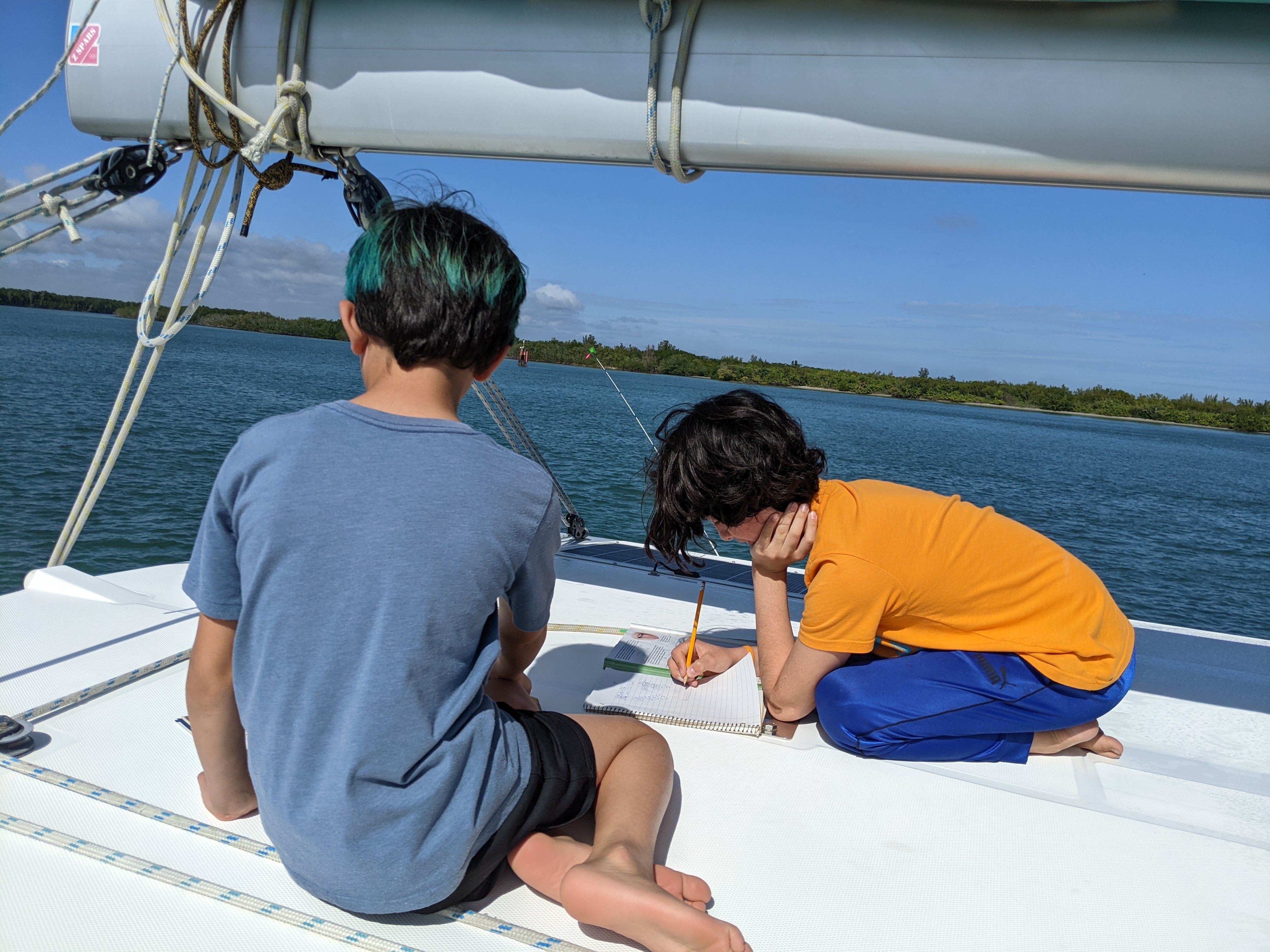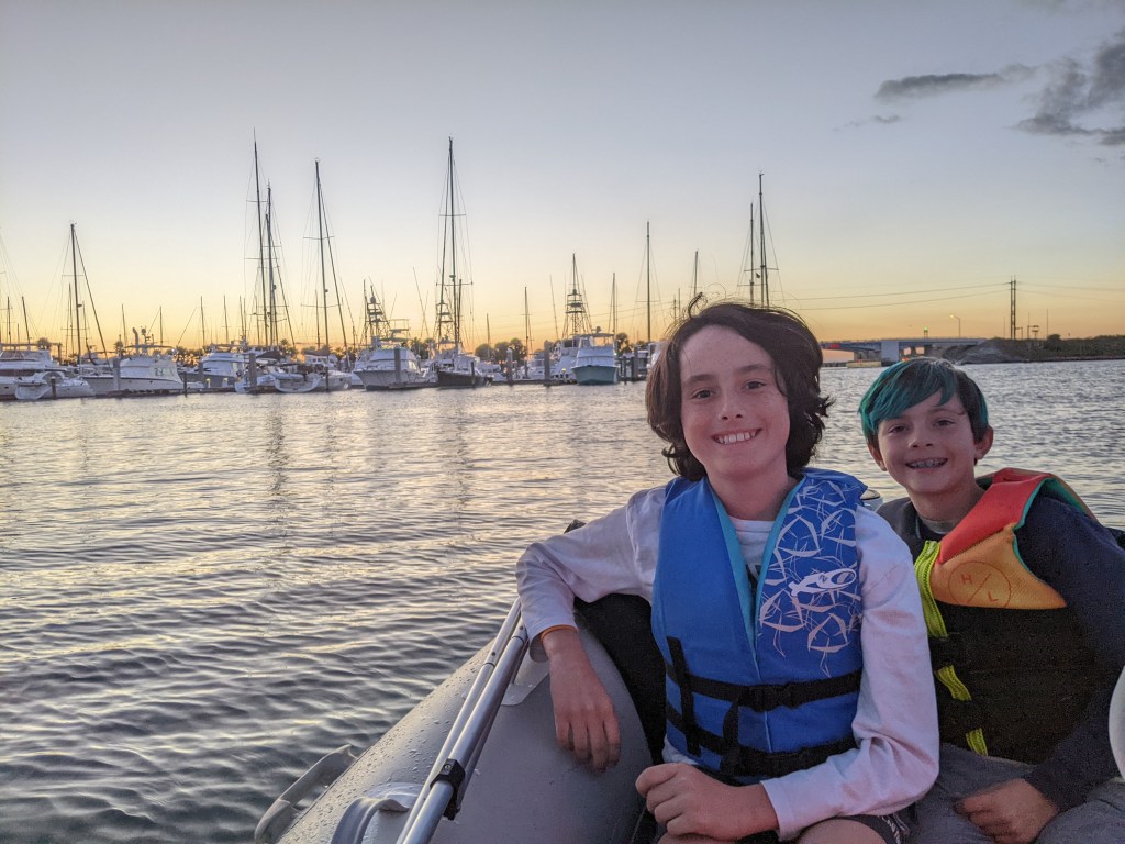 We were thrilled to get to pick up the boys and bring them aboard in Fort Pierce where we tried to get settled into boat life a bit by doing school (on the roof of the aft cockpit), getting comfortable with driving the dinghy, and working on fishing skills. We stayed at a marina where we waited for Devin the engine guy to complete the work on our port engine, which was, of course, “tired”.