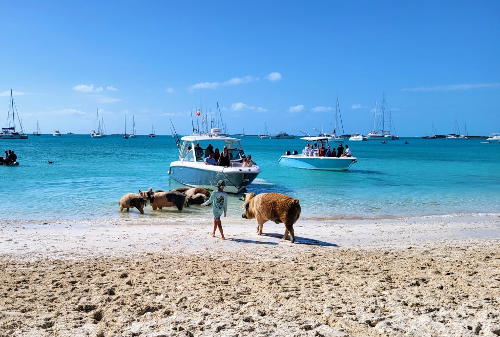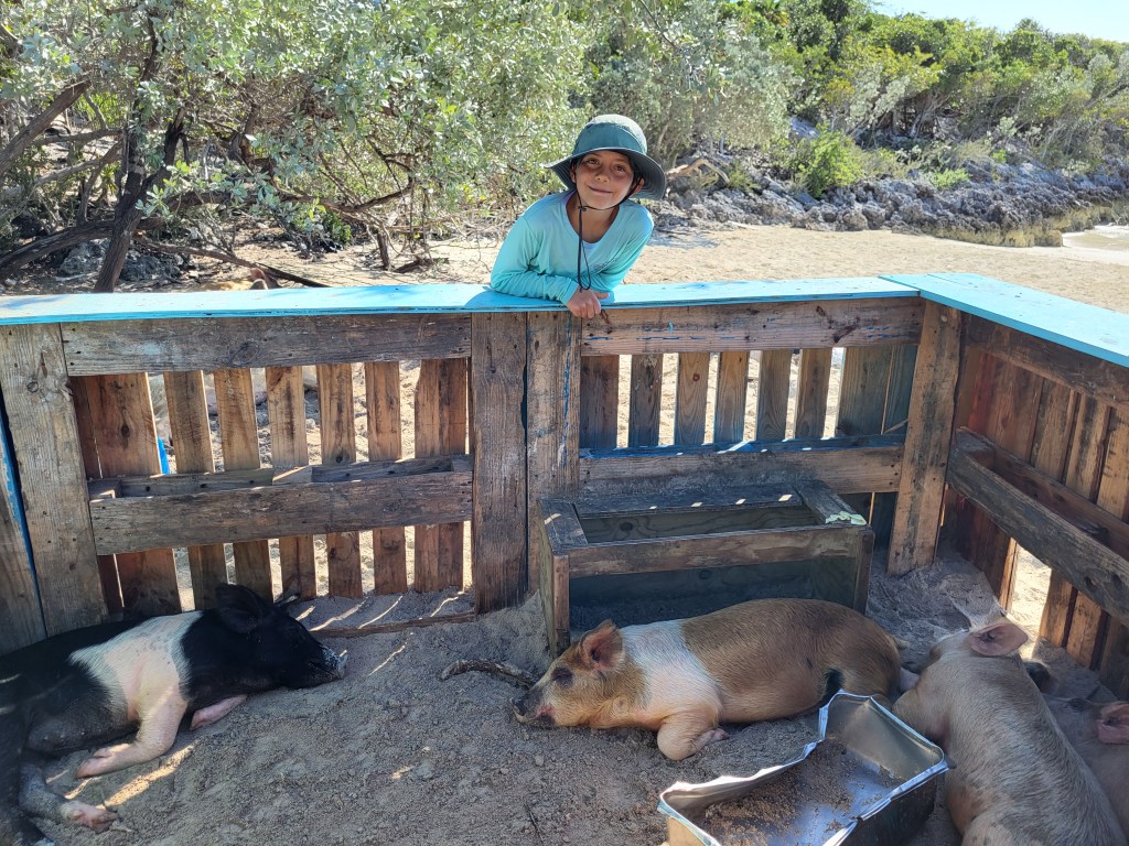 The famous Bahamian swimming pigs live on Staniel Cay. Tourist boats come by all day to feed them and cruisers like us save our kitchen scraps for them. Spencer bonded with a couple of them and was proud to introduce the big daddy pig to a tourist boat as they pulled up.