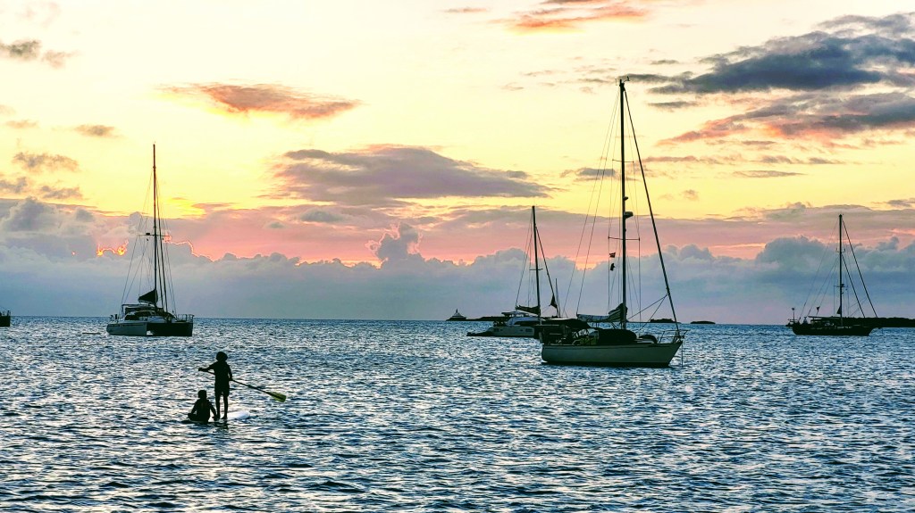 The boys are becoming more independent as they explore on the paddleboard and practice driving the dinghy. They take the hand-held VHF radio so that we can communicate. There is an impressive 80′ luxury sailing catamaran that has been at a few anchorages with us, that the boys refer to “The Tank”. They decided to finally go check it out on the paddleboard. We later found out that it was hosting Paris Hilton for her birthday. We ended up hanging out on the beach with the crew one day and they took photos with Morris, who continues to be a celebrity.