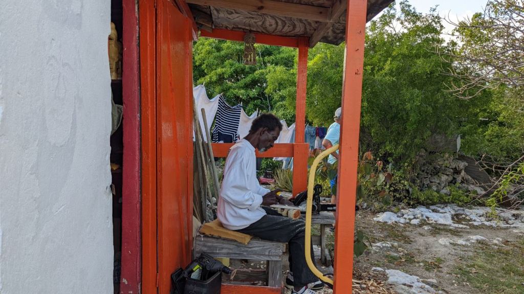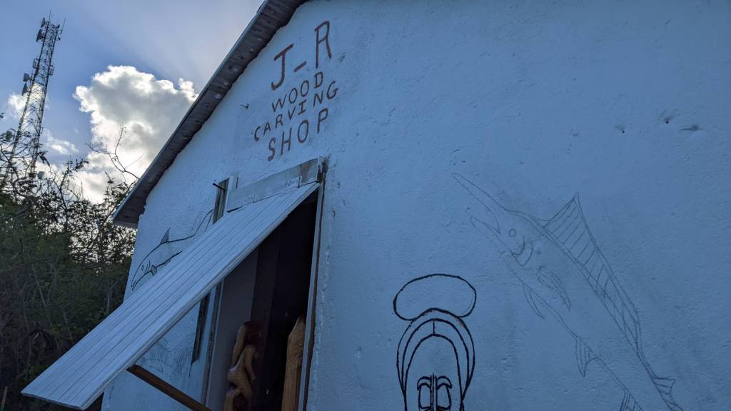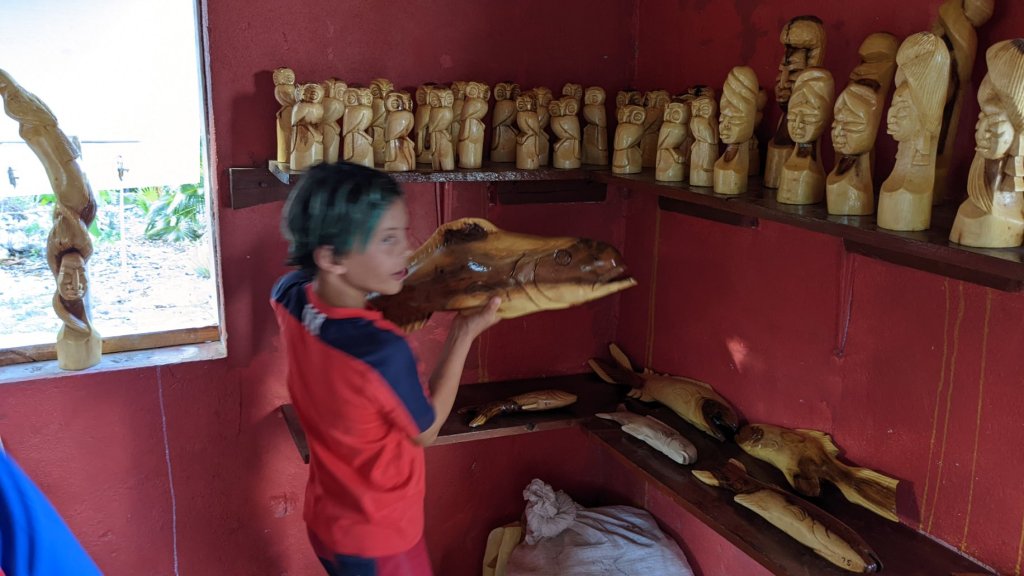 We were disappointed to learn that the ice cream shop was closed, and the owner was off-island with some health issues. Our only other option was a little restaurant/bar that our friends had been to last year and watched hermit crab races…. They had some freezer burned Rocky Road which wasn’t quite what I had been dreaming of, but it was still a treat. We hiked around and the boys found a tiny house where a man carves wood statues and decor by hand from the trees in the area.