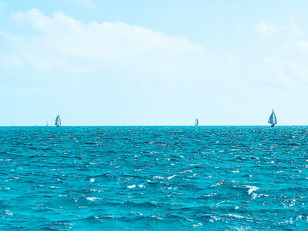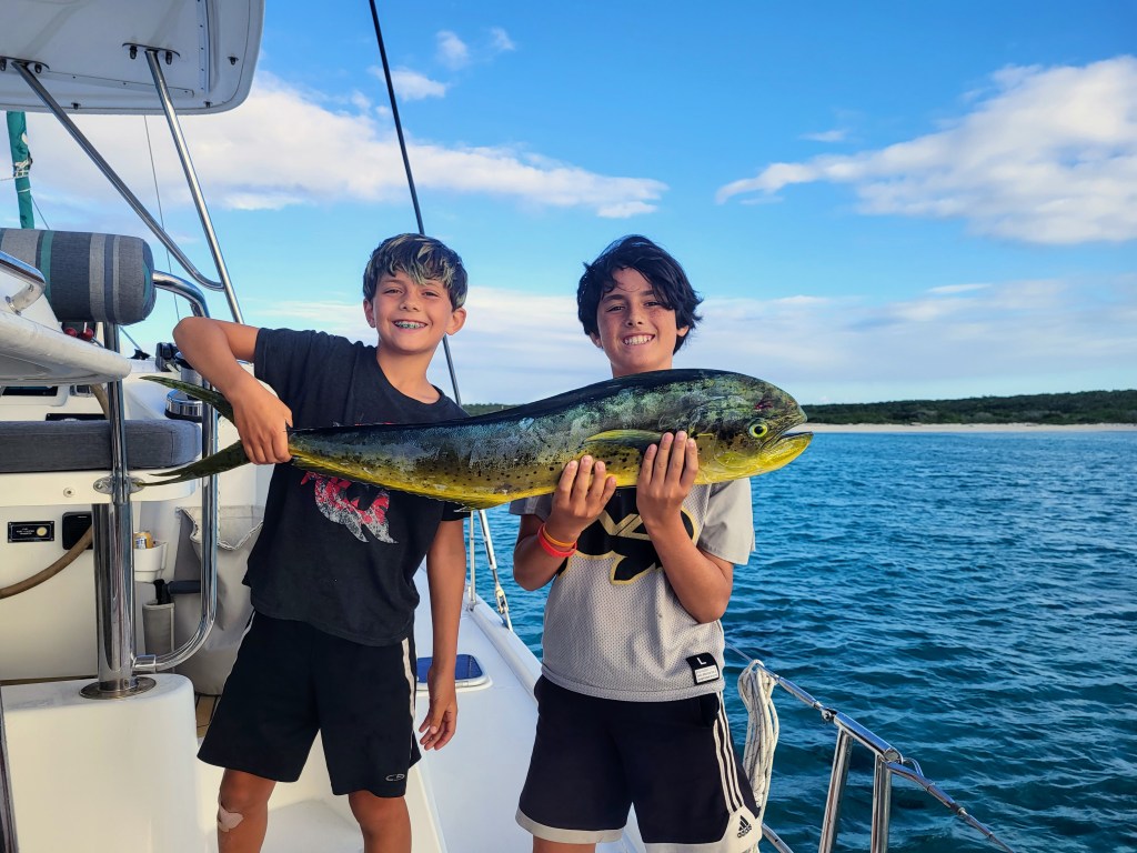 We had three fishing lines out as we were sailing along, and Tommy and I were at the helm looking around as we like to do, when he yelled out (probably some expletives… I don’t remember), pointing behind our boat. I turned around and saw two magnificent fish torpedoing through the water chasing our lures. It was stunning to see one of them jump out of the water and land right on our lure, as both of them caught and the lines went buzzing out! As Jackson and Tommy each grabbed a rod and started bringing in the fish, we could see that they were mahi by the bright green and blue colors. Both fish fought hard, and at one point the lines got crossed because I had to turn the boat into the wind to slow us down. Tommy was able to gaff the feisty mahi and get her aboard. Jackson unfortunately couldn’t overcome the crossed line against our davits on the back of the boat and that fish got away. All in all, it was the most exciting day of fishing we’ve ever had. We returned the barracuda to the ocean, and thanked the ocean and sharks for the generous trade.
