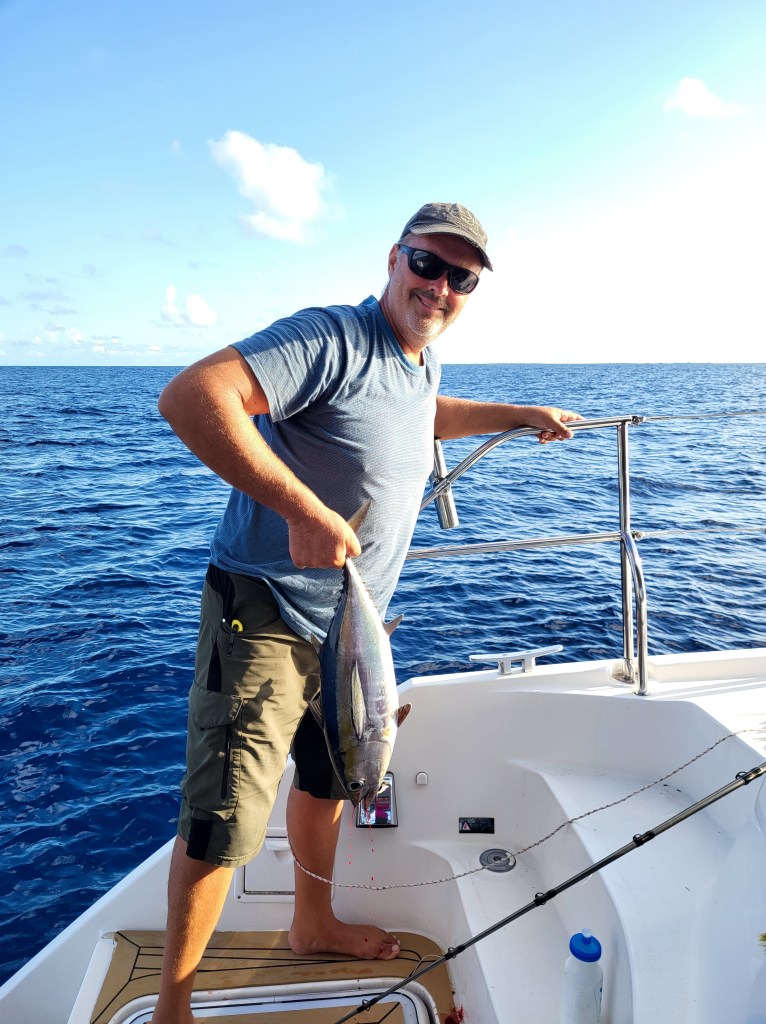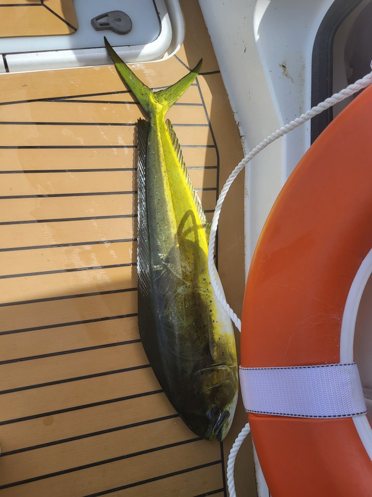Our trip home was looooooong, but had some great fishing success. We actually caught two tunas the first day, and got another little skipjack tuna after that which was so young that we released him. When we caught the tunas they hit at the same time, so we assumed they were mahi mahi. Everyone was excited to see that they were bigeye tunas. It was an thrilling afternoon and a relief to have a better dinner option since we were on our last provisions. The second day we caught a mahi mahi and another little tuna which we also released. That one was fun for me because I was at the helm and could see a bird/fish frenzy and turned the boat into it, where we saw a bunch of different fish jumping and birds swooping down. Since we had the mahi on board and two tunas from the previous day, we all voted to release the little one.