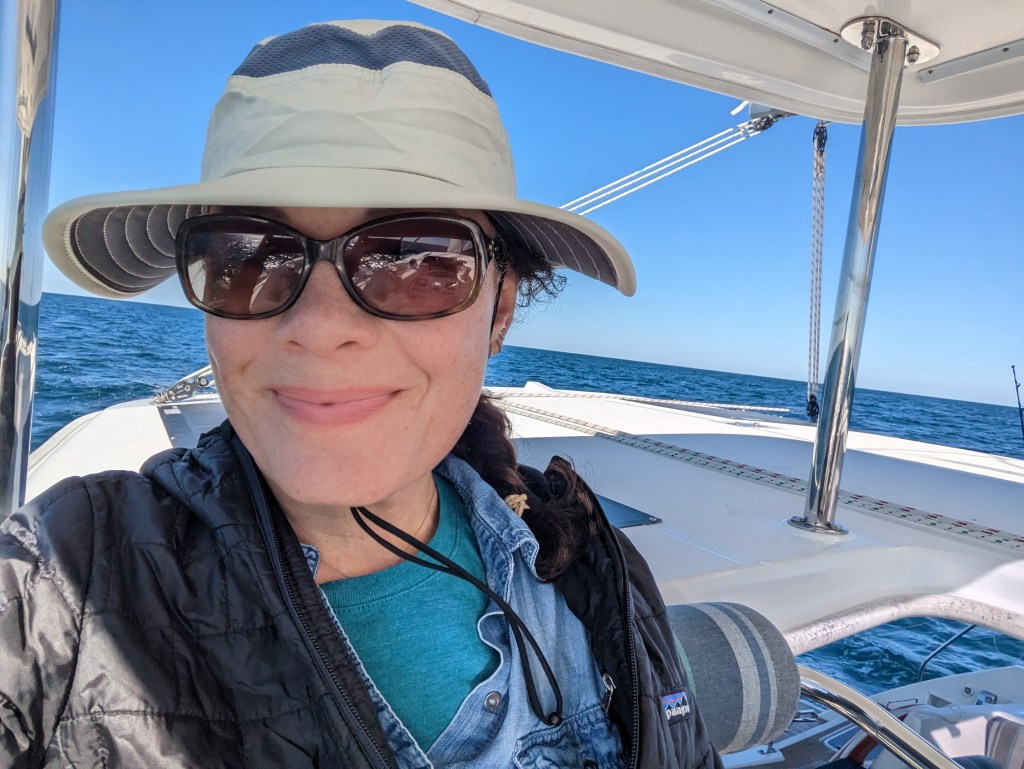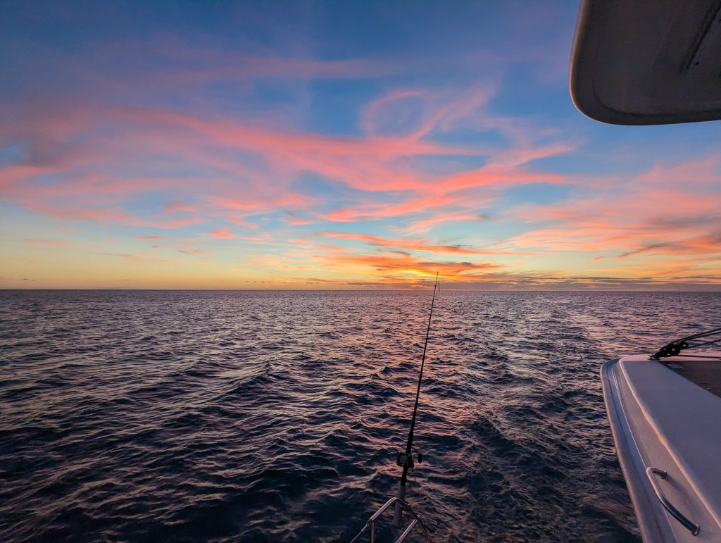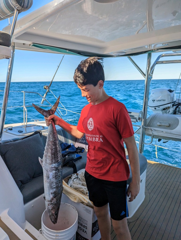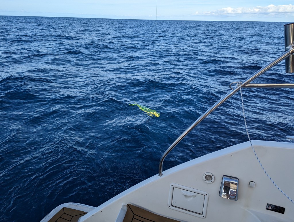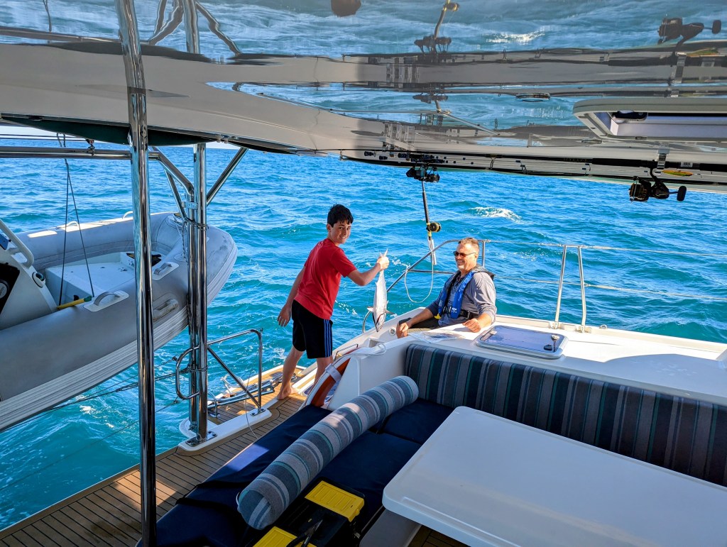 We sailed at a good clip for a lot of the first day and caught a handful of fish. Jackson invested in a hand scale to weight the fish we catch and he’s documenting the type of fish, size, and weight. The first one we caught was a Kingfish or King Mackerel that Jackson reeled closer to the boat and then handed over to Spencer to let him bring it in. Mackerel is known to be kind of oily and fishy, but we didn’t know what it was until it was on board so we kept it. The others were a few big eye tuna. We caught a mahi mahi without realizing it, as Tommy and I were in the front of the boat and the boys were inside, so nobody heard the line run out. Tommy spent a lot of time processing fish, putting it in vacuum sealed bags, labeling and putting them in the freezer. The mackerel ended up being delicious because it was so fresh, but we learned that you have to eat it immediately, and vacuum seal the rest and freeze it immediately, because when we tried leftovers the next day it almost made Spencer and me barf. Fortunately Tommy had sealed and frozen the rest.