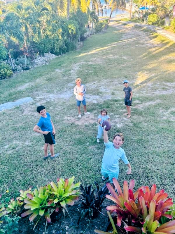 The Yacht Club hosted a free buffet dinner and drinks, so we walked there (partially on an airstrip!) from our beach, and joined all the other cruisers at the crowded yacht club. The boys were happy to play with their Summerwind friends, a few other boys they met as well. Jackson has started to take his football with him whenever we go ashore, and it often attracts kids to play.