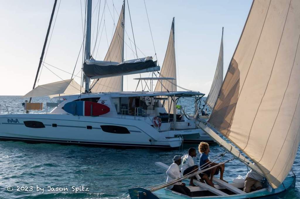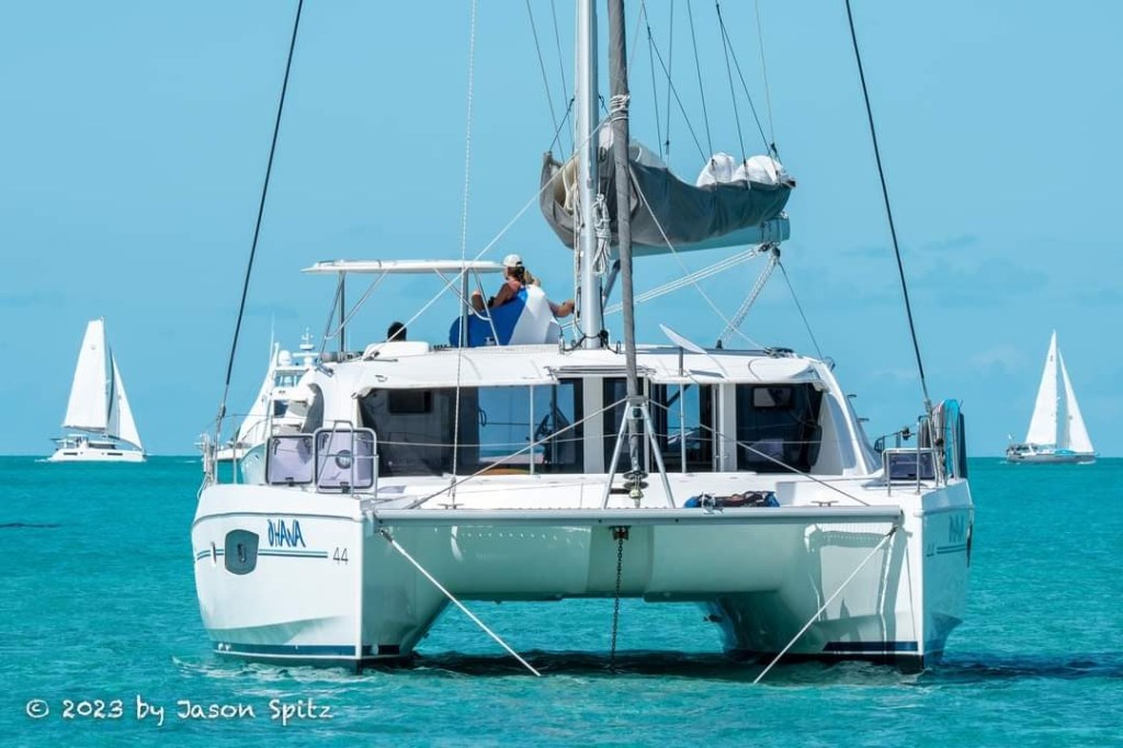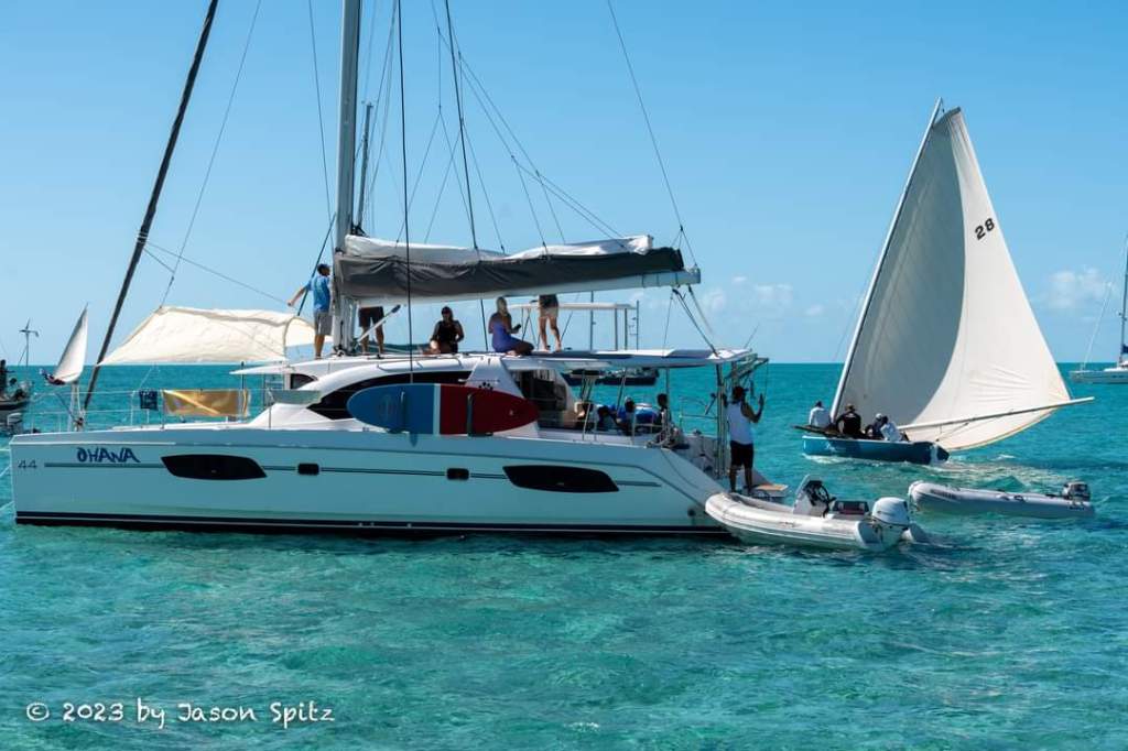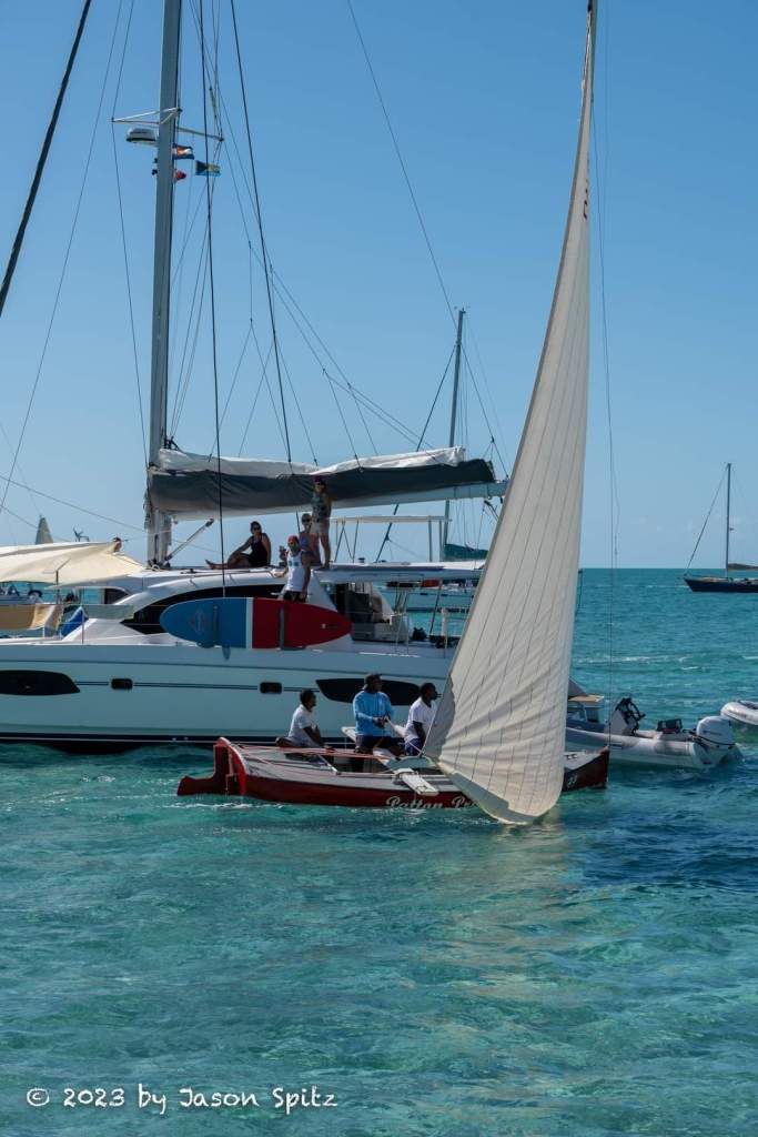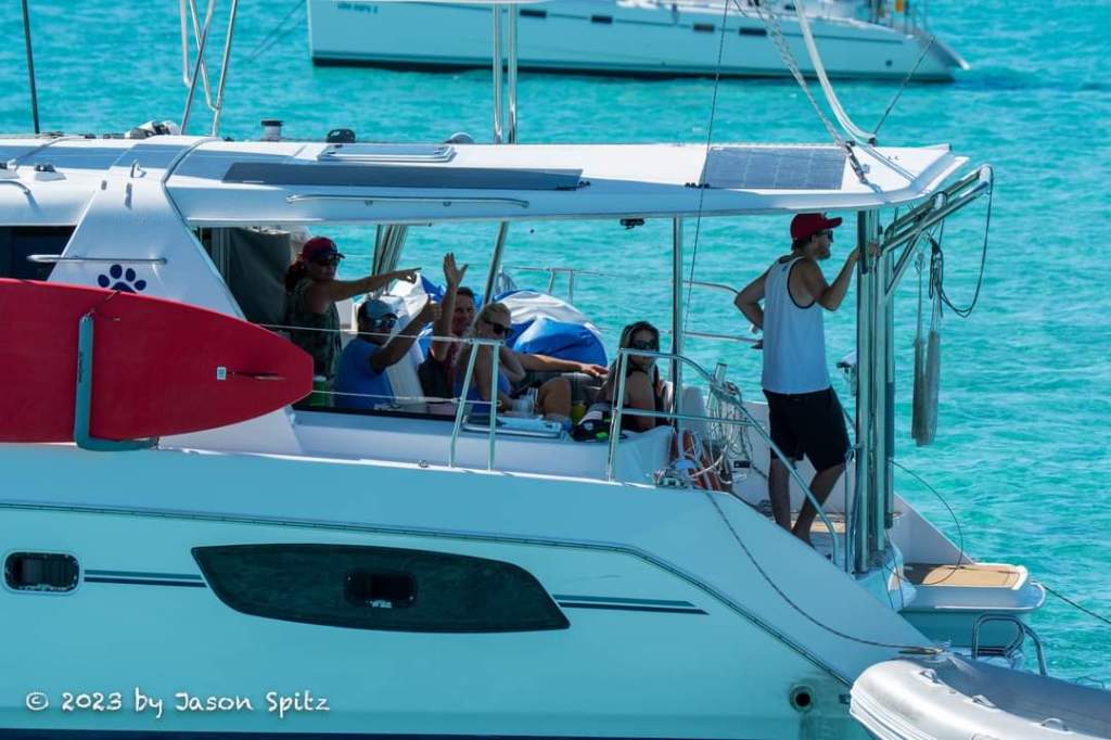 A short sail away from Black Point is Little Farmer’s Cay. They have an annual First Friday of February Festival at Farmer’s, aka 5F’s, which had not been held since COVID, so everyone was really excited about it. We arrived at the anchorage just in time to watch the Cruisers’ Race from our boat. Our neighbor boat took some great photos including one of us watching from our coach roof. We found out later that our friend from Ohana Kai was one the three people who sailed the winning boat. You can see the boat, a beautiful gray Beneteau, on the right side of the photo of Ohana, followed closely by a Leopard catamaran!