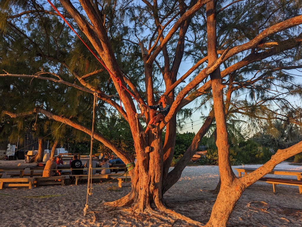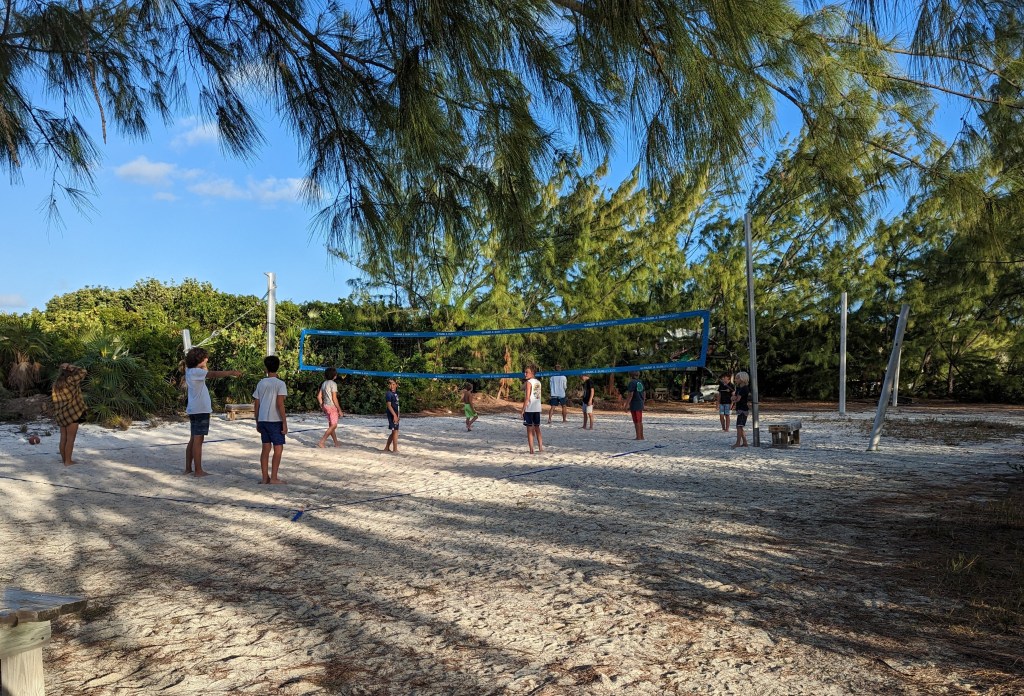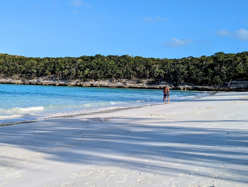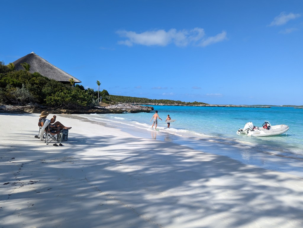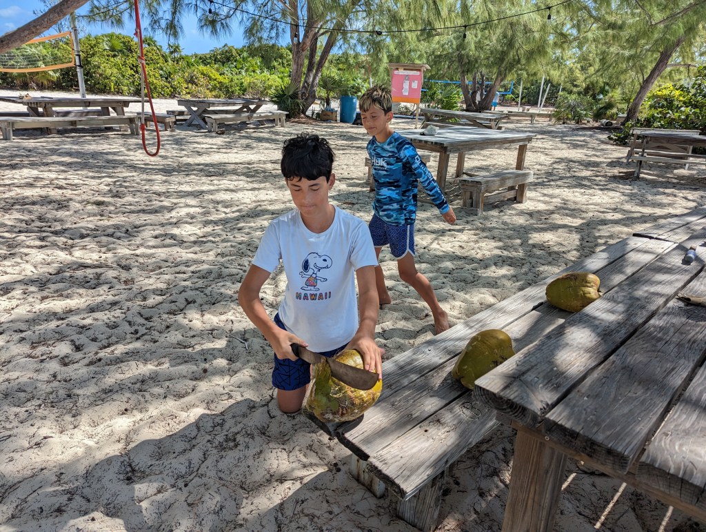 Fortunately it was not a long trip, and we arrived safely in Georgetown, where there was good protection from the wind. Evidentally every other boater in the area had the same idea…. Georgetown was crowded (but it always seems to be). We anchored in a good spot right in front of the Monument hill which offers excellent protection, and settled in for a windy week. We did boat school and listened to the cruisers’ net in the mornings, spent afternoons at Chat n’ Chill, and got soaked by the waves every time we took the dinghy out. Jackson and Spencer got some coconuts from the trees near Chat n’ Chill one day (after they asked permission from the restaurant), and drew the attention of a few other boat families as they broke them apart and shared the juice and meat. Some of the other parents specifically commented on Jackson’s skills and care with the machete. It was fun to learn the different techniques people use to open coconuts. Chat n’ Chill was closed for the last few days of our time in Georgetown, because someone reported health code violations and they were forced to close and clean up. Not surprising, actually… We never eat there for a reason.