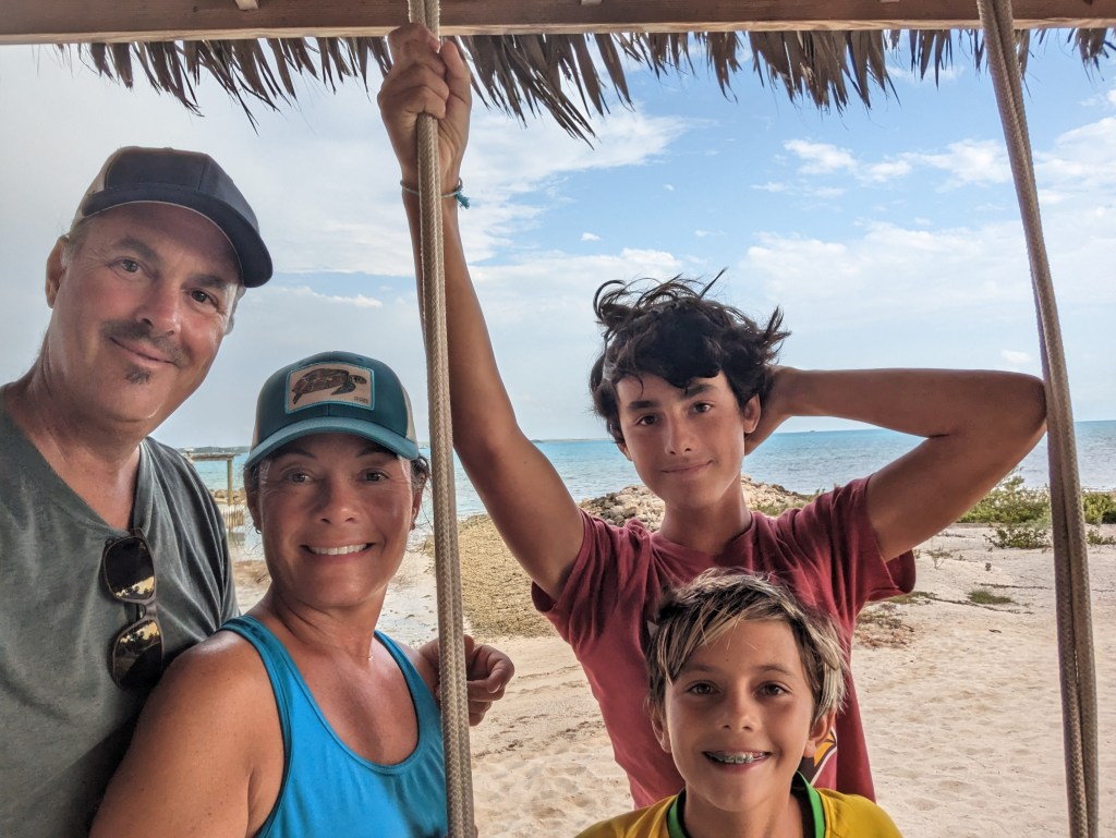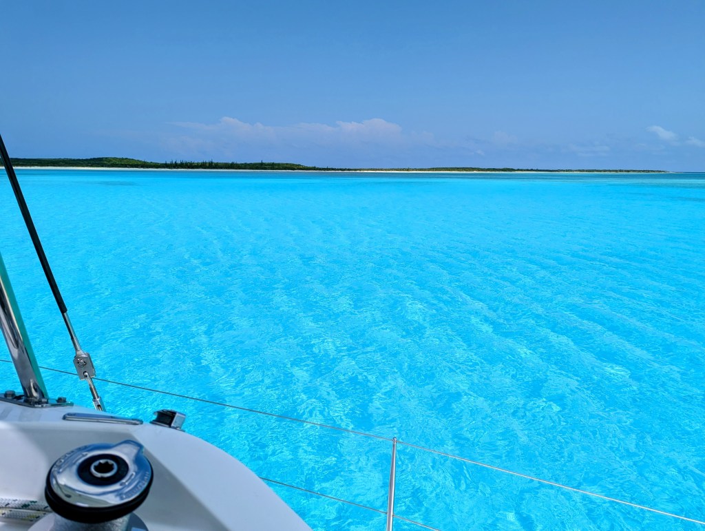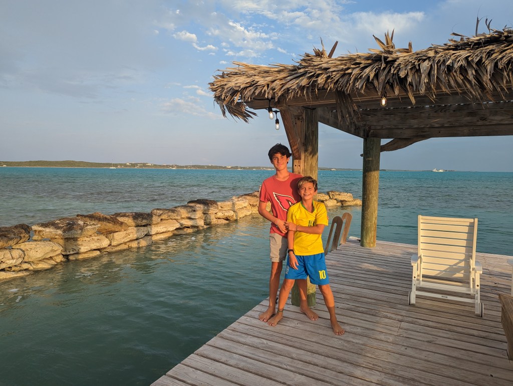 We visited Long Island last season with about 10 other kid boats. This year it was just us, so it was a very different experience. We anchored in the Southernmost bay on the west side of the island after crossing from Crooked to Long and catching a couple of tunas along the way. The anchorage is a lovely bay with a very shallow section between the bay and the beach, and a small boat wrecked on the end. We took the boys wakeboarding and relaxed, and spent the night there. There is a colorfully painted restaurant on the beach called Gordon’s, which I read about in my book. We didn’t feel like going ashore and since we don’t have Morris this season, we didn’t have to.