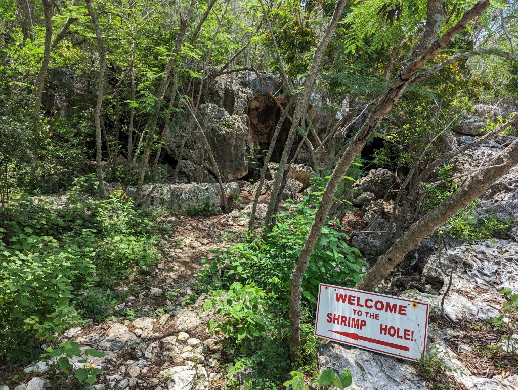 There is an inland cave that is home to some special shrimp, so we hiked to the cave to check it out. It was extremely hot with very high humidity, and since it was inland there was no breeze. The boys and I got several mosquito bites on the hike. Once we arrived at the shrimp cave, we realized it was infested with mosquitoes and even if we wanted to stay, none of us wanted to swim in the creepy, brackish water with some shrimp living on the bottom…. See previous post about Tommy’s dislike of dark water for further details.