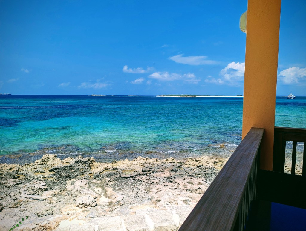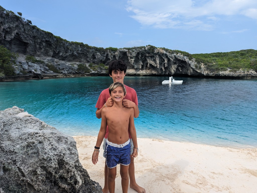 We made it to Clarence Town for lunch, but it was not as much of a town as we had expected. There were some homes and at least three churches (including a Greek Orthodox church), but no places to eat. We worked our way over to the marina where we found a beautiful restaurant overlooking the Atlantic side. We would never have gone to this side without a car because the East side ocean can be so rough, and the island is so long that we couldn’t easily swing back around in the boat to the protected West side. The restaurant was fancier and more expensive than we wanted, but we didn’t have any other options, and the food was good. They even made fresh squeezed lemonade for the boys. When we asked our server where they would go if they had a car for just one day, they said Gordon’s Beach because it’s such a  picturesque white sand beach, the shrimp Cave (“but you might get eaten by mosquitoes”), Dean’s Blue Hole, and the Columbus Monument on the North End (“even though Columbus was a dick”, they said). After marveling at the beautiful bathrooms at the restaurant, we headed off to Gordon’s Beach, forgetting that we had just anchored there two nights ago.