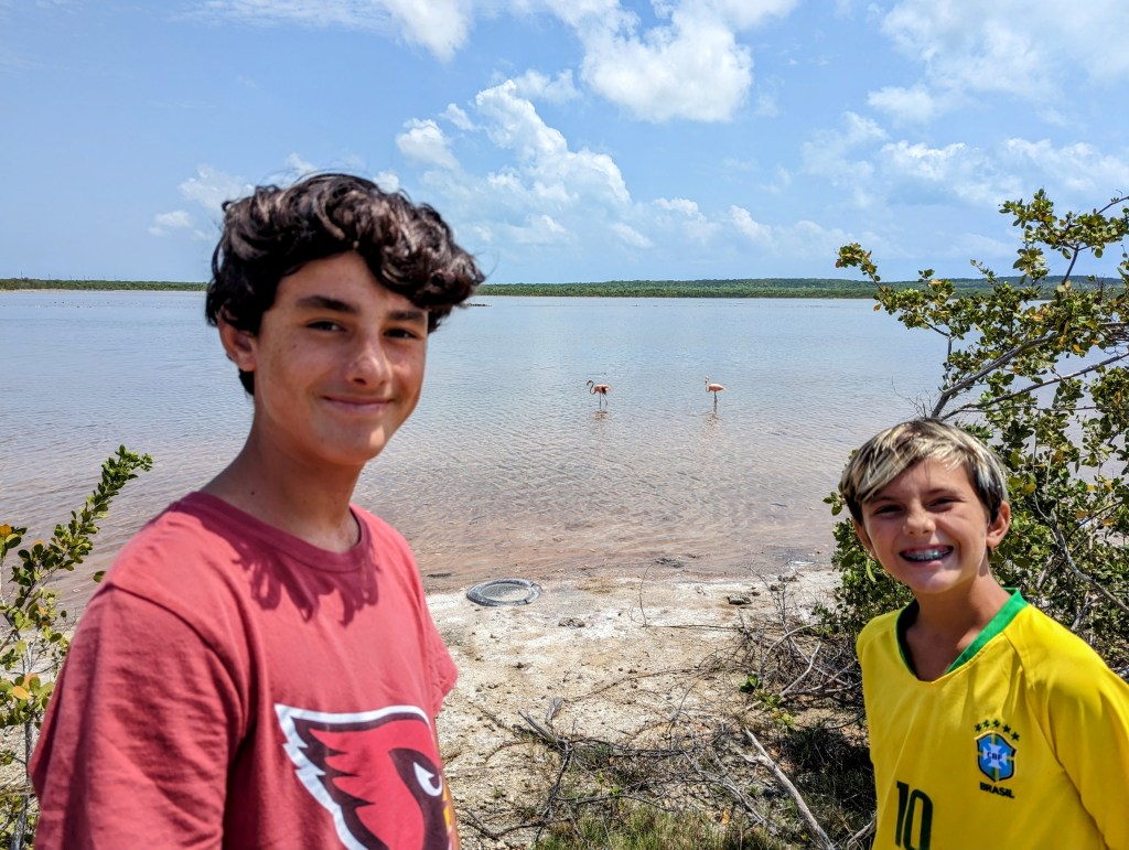 As we were driving South from the marina, we passed some salt ponds and Tommy abruptly pulled over…. Flamingos! There were just two of them hanging out, and they had no problem with us quietly approaching them and taking photos. The boys and I were so thrilled.