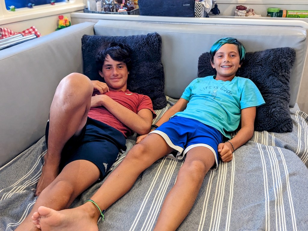 The next day we motor-sailed to Calabash Bay where we only had a short stay last season, and we were looking forward to going back to spend more time there. We played almost all day at the beach the first day, the boys went paddleboarding, and we scoped out the nearby reefs for snorkeling, but they were mediocre at best. We watched movies on a stormy afternoon, I dyed Spencer’s hair, and we played poker for Oreos.